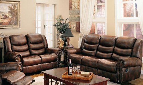 2pc Recliner Sofa Set with Nail Head Trim in Brown Leather Like Fabric Review